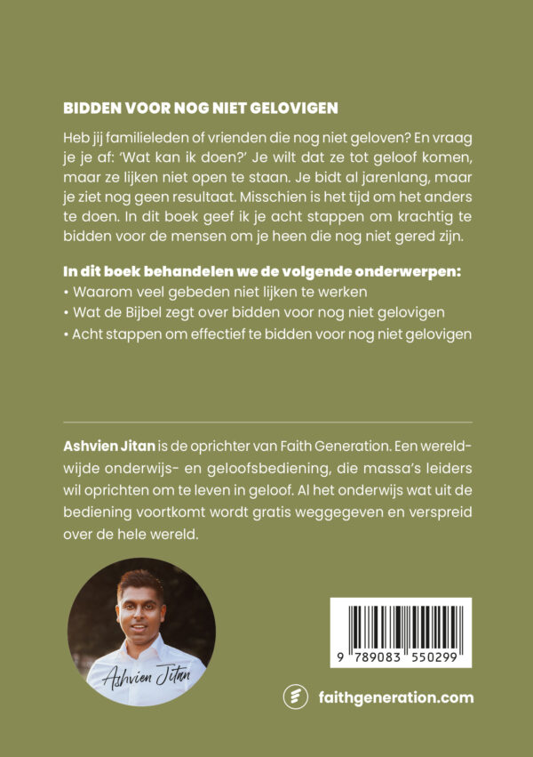 Heb jij familieleden of vrienden die nog niet geloven? En vraag je je af: ‘Wat kan ik doen?’ Je wilt dat ze tot geloof komen, maar ze lijken niet open te staan. Je bidt al jarenlang, maar je ziet nog geen resultaat. Misschien is het tijd om het anders te doen. In dit boek geef ik je acht stappen om krachtig te bidden voor de mensen om je heen die nog niet gered zijn.